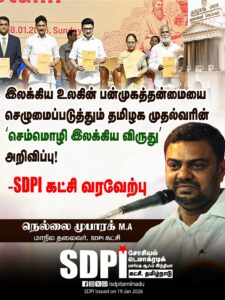 இதுதொடர்பாக எஸ்டிபிஐ கட்சியின் மாநிலத் தலைவர் நெல்லை முபாரக் வெளியிட்டுள்ள அறிக்கையில் கூறியிருப்பதாவது: தமிழ், தெலுங்கு, கன்னடம், மலையாளம், ஒடியா, வங்காளம் மற்றும் மராட்டிய மொழிகளில் ஆண்டுதோறும் வெளியாகும் தலைசிறந்த இலக்கியப் படைப்புகளுக்கு, தமிழ்நாடு அரசு சார்பில் மொழி வாரியாக “செம்மொழி இலக்கிய விருது” வழங்கப்படும் என மாண்புமிகு தமிழ்நாடு முதலமைச்சர் மு.க.ஸ்டாலின் அவர்கள் அறிவித்துள்ளது வரவேற்கத்தக்கது.